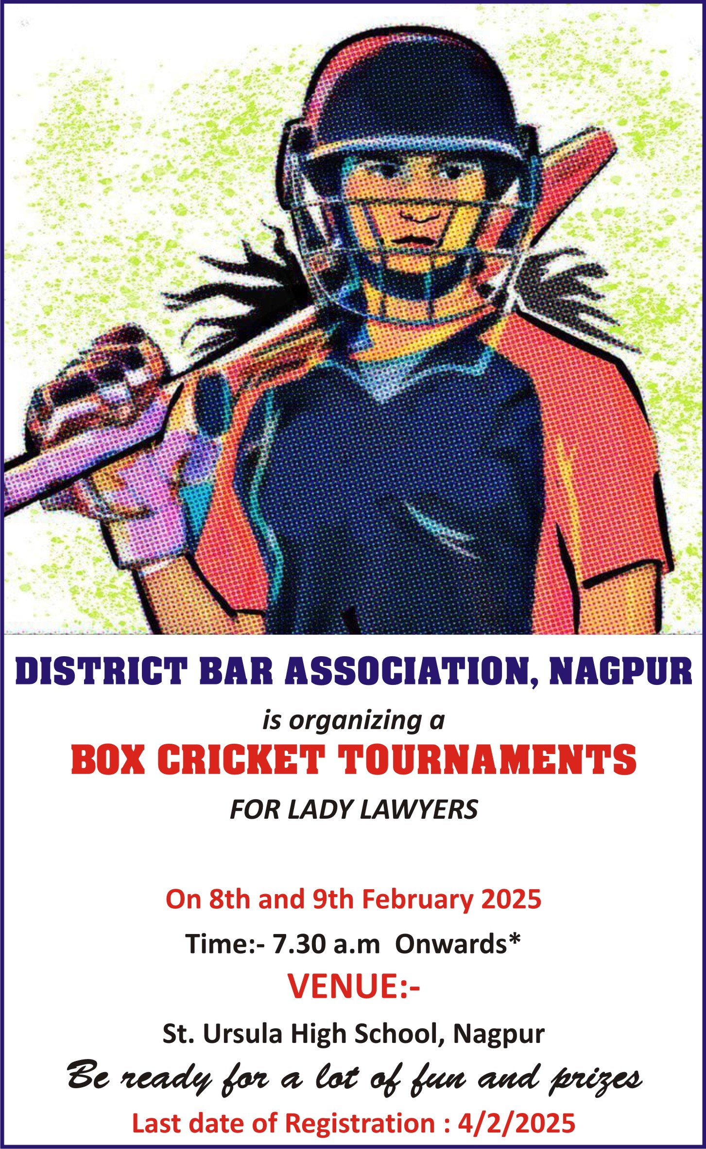 | 3 | Box Cricket Tournament 2025 | DISTRICT BAR ASSOCIATION, NAGPUR\r\nis organizing a BOX CRICKET TOURNAMENTS FOR LADY LAWYERS \r\nOn 8th and 9th February 2025 | 31/01/2025 | View File |